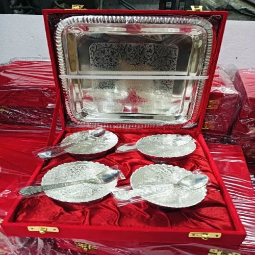 Elegant gift set including a German silver bowl, matching spoon, and tray